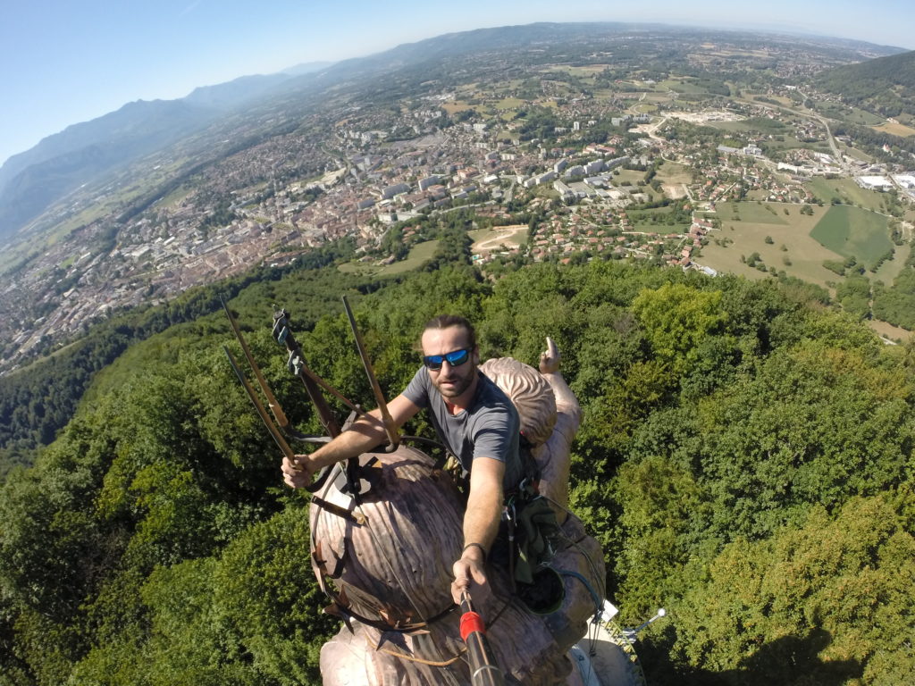 La mise en beauté de notre Dame de Vouise de façon acrobatique a été réalisée par Gwenaël PICTON (Cyprès De l’Arbre) accompagné par le service technique de la Ville de Voiron pour assurer la logistique et Pépinières Vincent pour le transport en 4×4 du gros matériel.